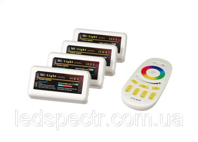 Представлений Пульт контролера RF RGB 18 А 4 zone. Пульт дасть змогу керувати відразу чотирма зонами підсвічування. Виготовлений у сенсорному стилі.